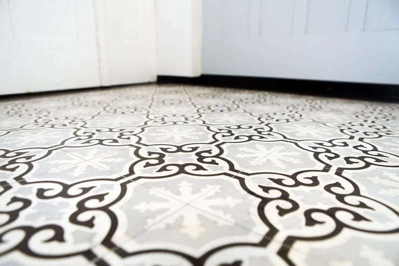 Arbeiten: | Bei unserem privaten Auftraggeber haben wir im Eingangsbereich Zementfliesen verlegt. Sie überzeugt dort durch ihre bunte Optik. |